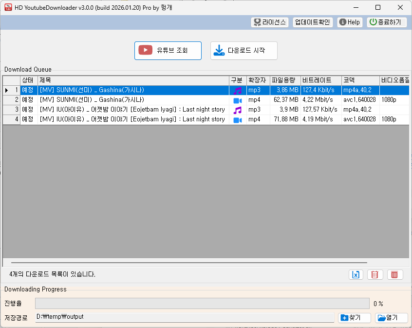 [다운로드 시작] 버튼을 누르면, 여러건의 유튜브 자료를 한꺼번에 다운로드 받을 수 있습니다.