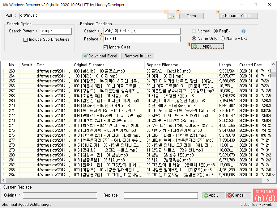 폴더의 파일을 검색해서, 지정된 Normal Text 또는 정규식(RegEx) 으로 파일명을 변경할 수 있습니다.