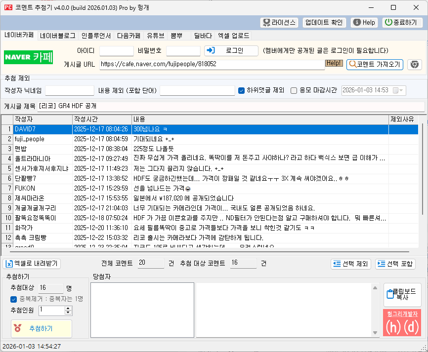 - 내용 제외 : 코멘트 내용중에 특정 문구가 들어간 코멘트는 추첨 대상에서 제외한다.