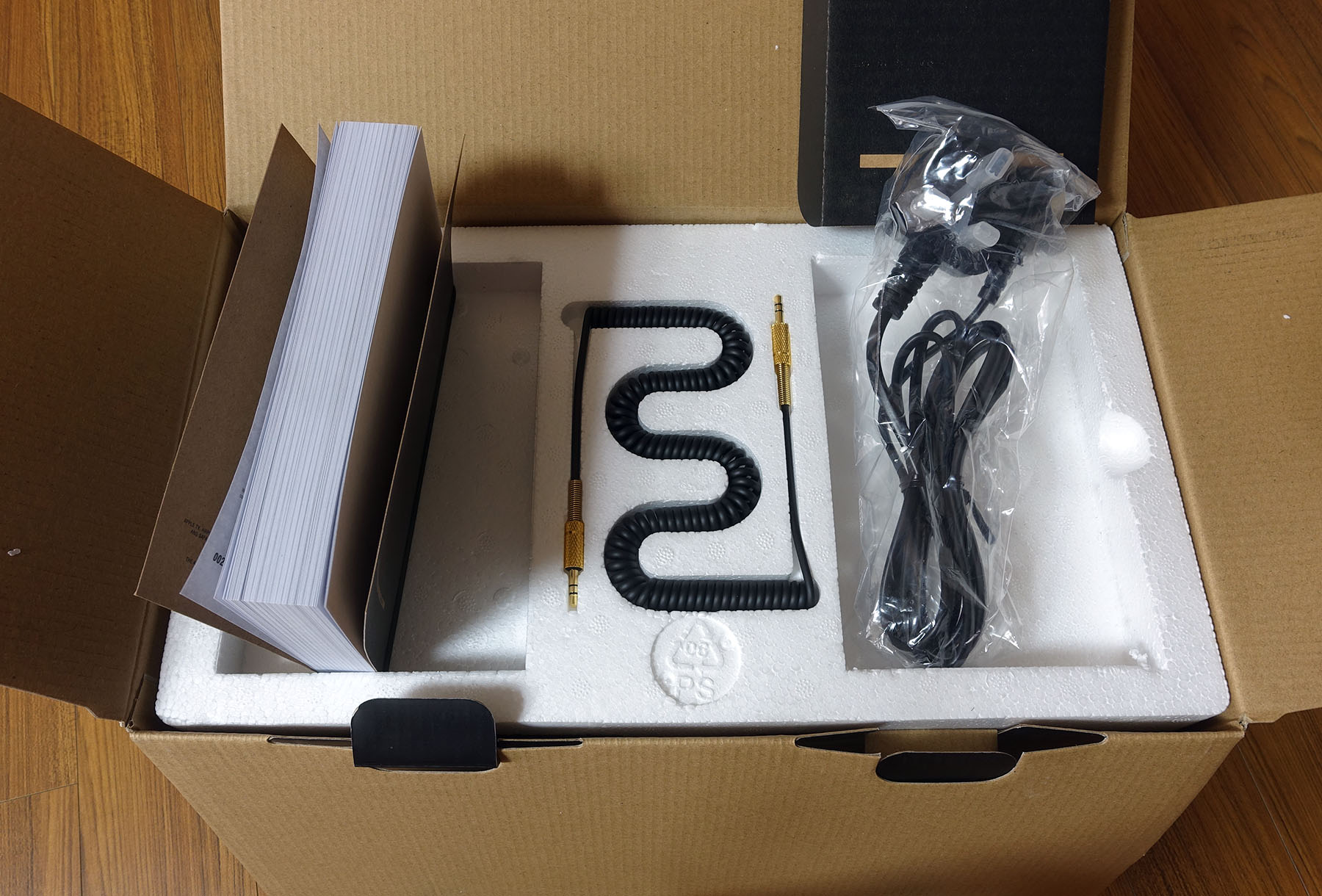 박스를 열어보면, 매뉴얼과, 고급스러워 보이는 AUX 케이블이 보인다.