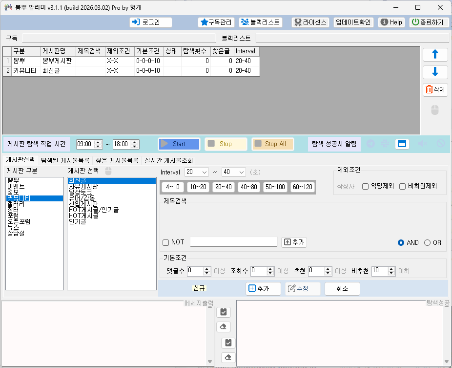 3. [게시판 탐색 작업 시간]이 끝나면, 탐색이 일시 중지되고, 익일 탐색 작업 시간이 되면 자동으로 다시 시작됩니다.