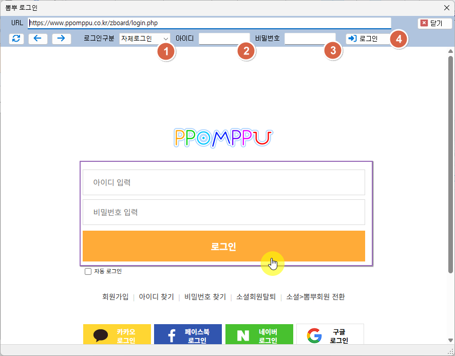 프로그램을 처음 시작하면, 뽐뿌 로그인 웹뷰가 뜨게 됩니다.
