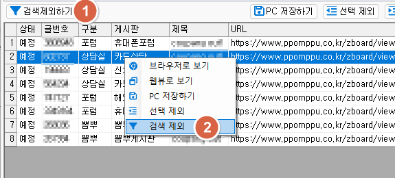 7. 검색 제외 - 상단의 [검색제외 목록] 관리 데이터로 등록하고, 목록에서는 바로 삭제된다.