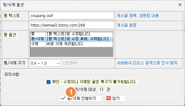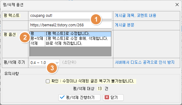 3. 펑/삭제주기 : 펑/삭제하기 진행시에 하나씩 순서대로 처리를 하는데, 이때, 하나 펑/삭제 처리후에, Interval 을 주게 된다.