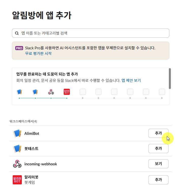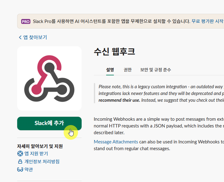 일단, 슬랙에 webhook 을 추가해야 한다.