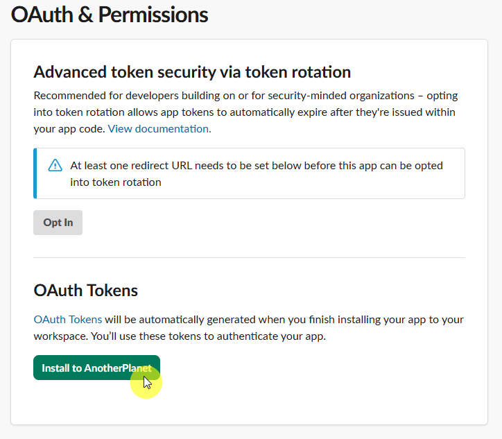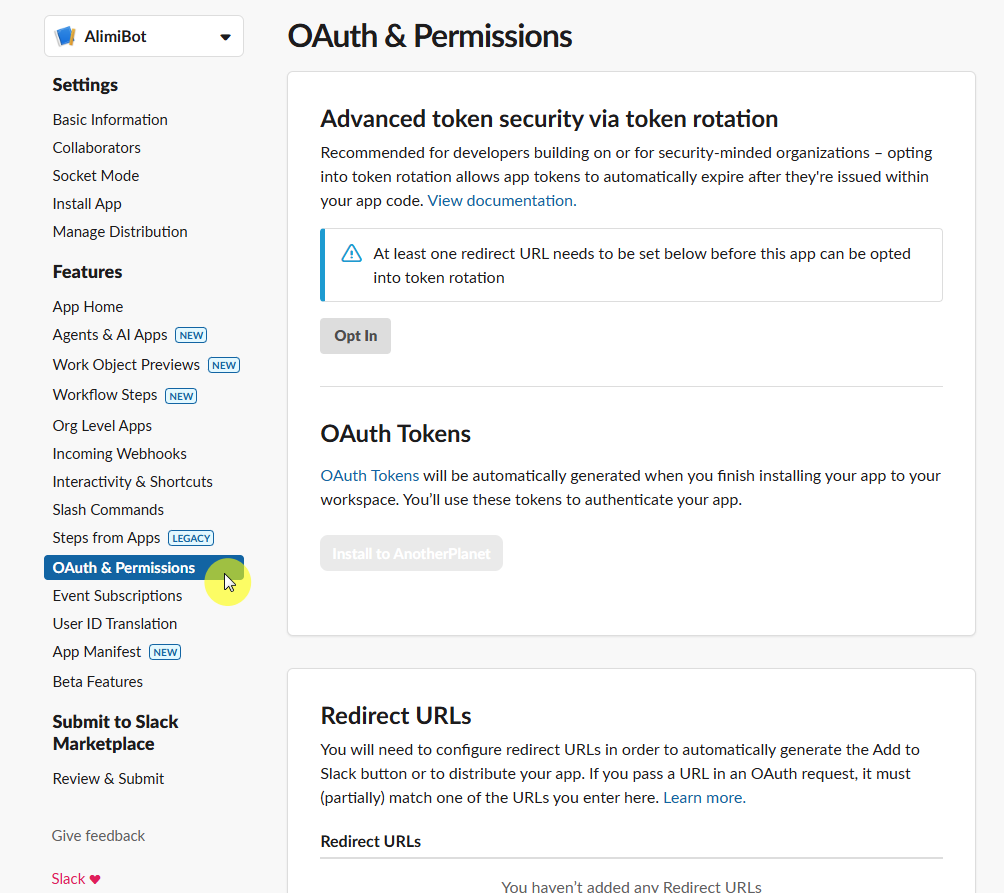 다음 화면에서, OAuth & Permissions 를 선택한다.