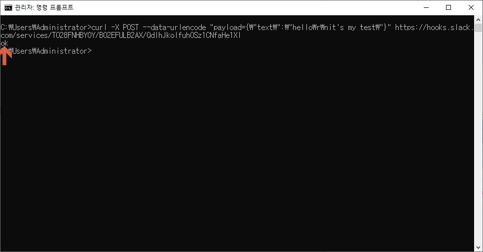 이제, cmd 창에서 curl 명령어로 TEST 메세지를 보낼 수 있다.