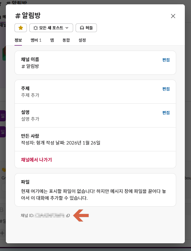 슬랙으로 가서, 메세지를 수신할 채널 세부정보 보기를 보면 하단에, 채널 ID 가 있다.