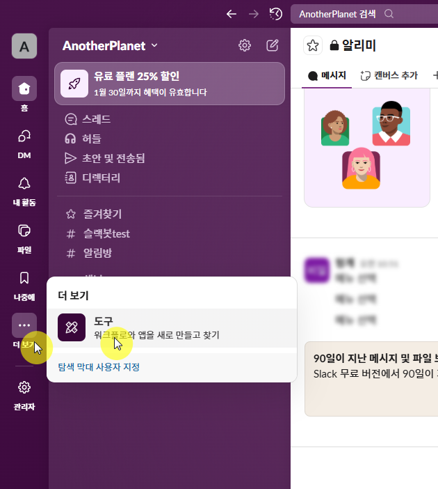 슬랙에서 [더보기] -> [도구] 를 눌러서, incoming webhooks 를 추가해야 한다.