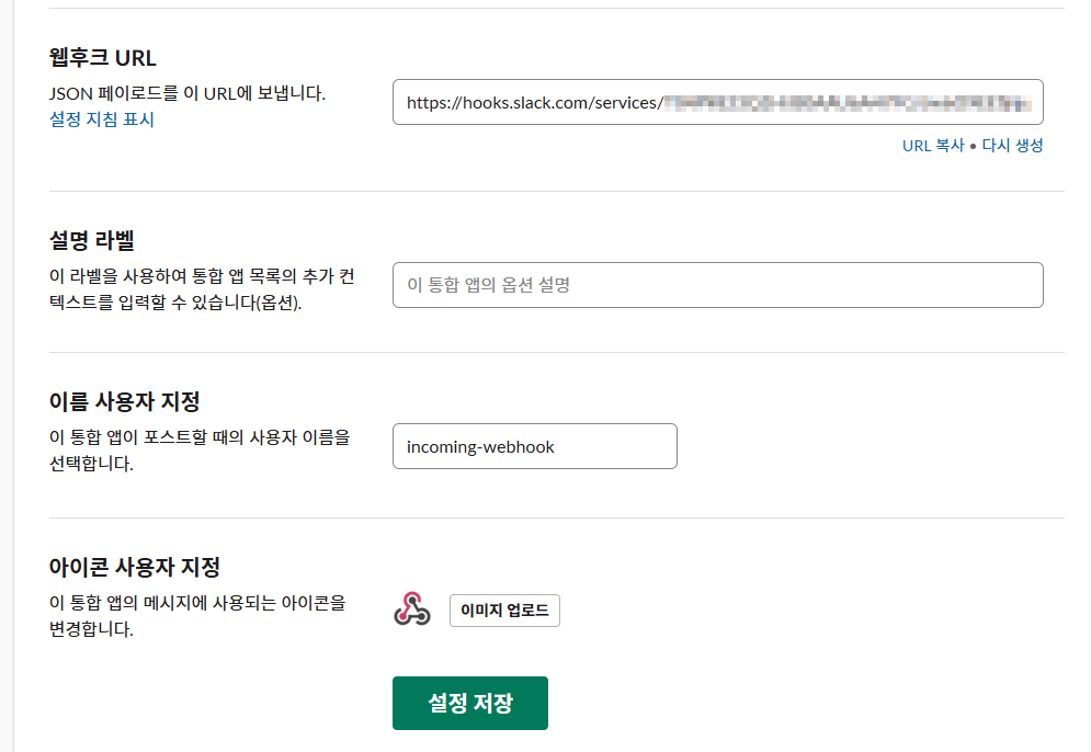 일종의 웹토큰으로, 슬랙봇에서 메세지를 보낼때는 별도의 로그인없이. 웹후크 URL 만 알면, 메세지를 보낼 수 있다.
