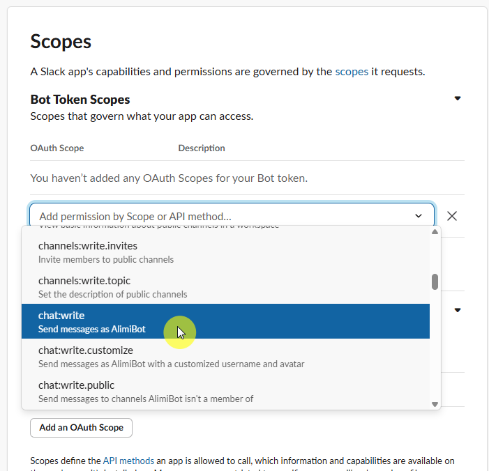 [Bot Token Scope] 에 Add an OAuth Scope 를 눌럿, chat:write 를 선택한다.