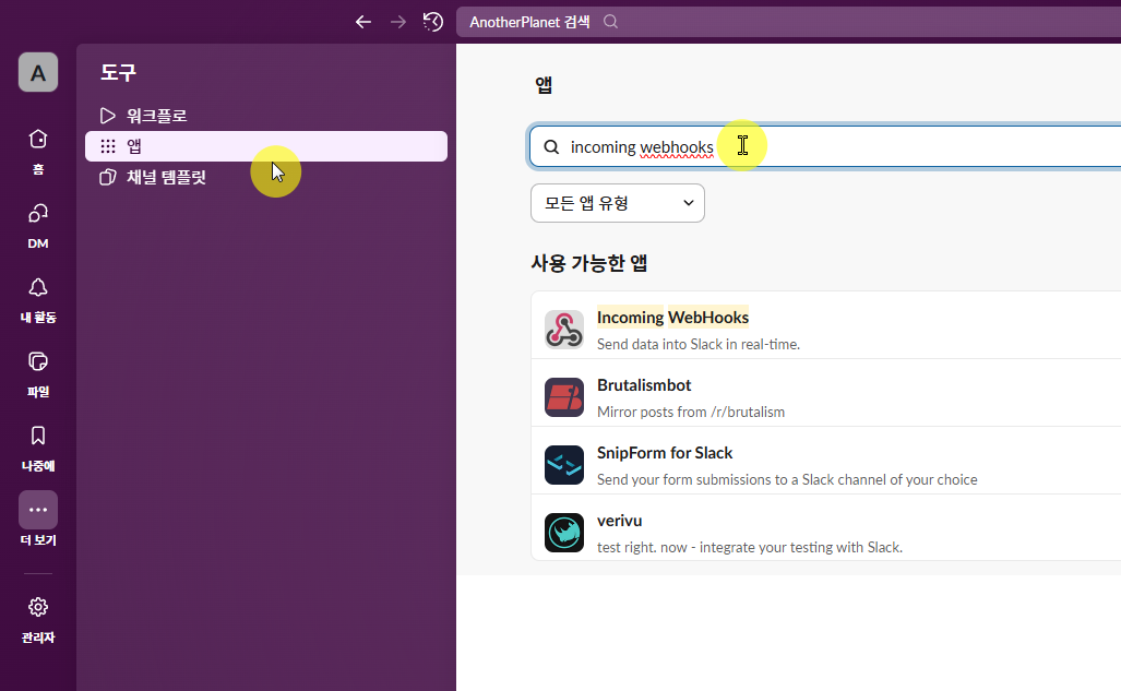 [도구] > [앱] 으로 가서 검색어에 incoming webhooks 를 입력하면, 제일 위에 나오는