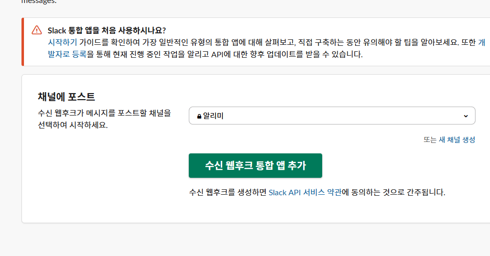 채널을 선택하고, [수신 웹후크 통합 앱 추가] 눌 눌러주면 된다.