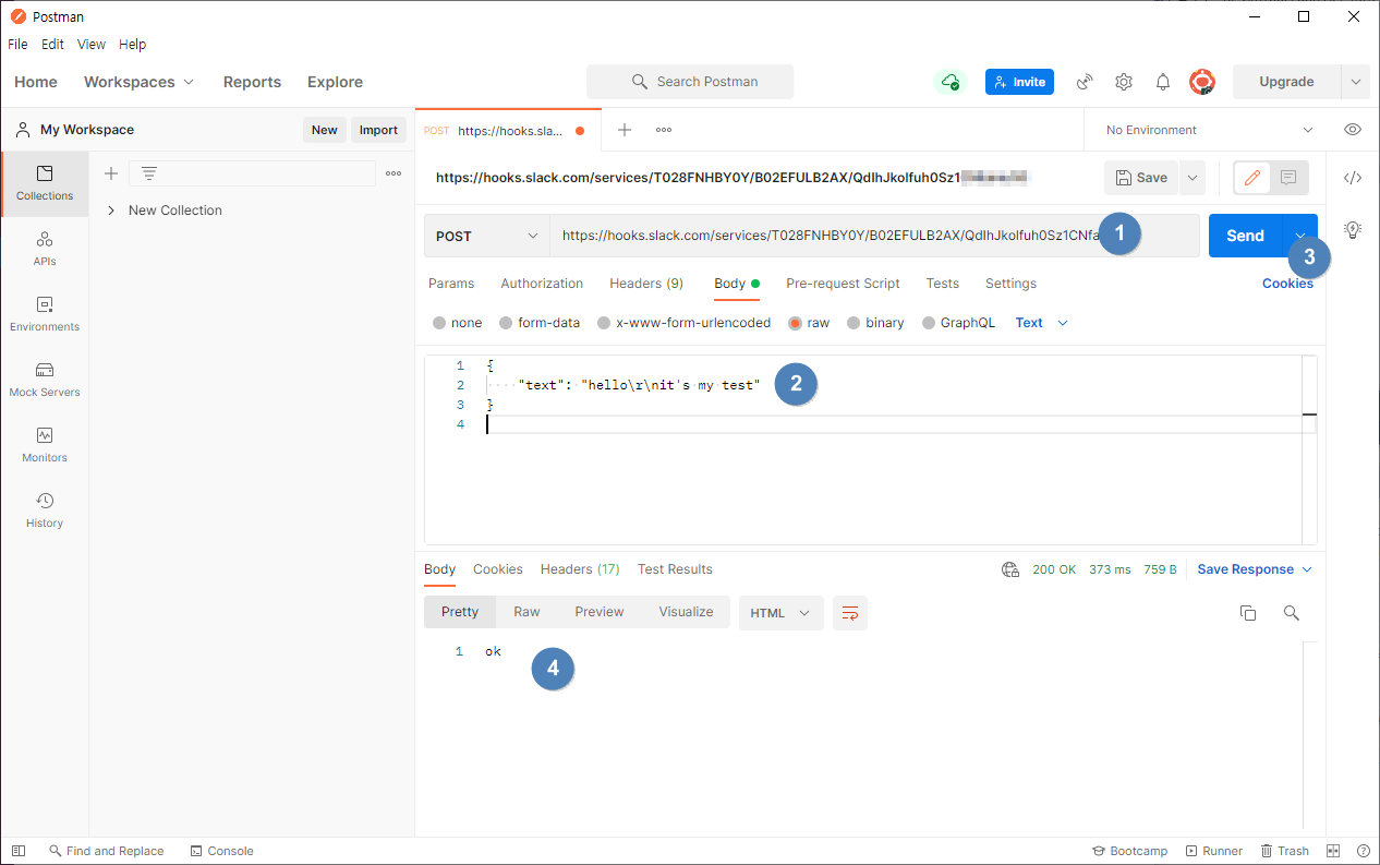 위에서 저장한 웹후크 URL 로 바로 메세지를 날릴 수 있다.
