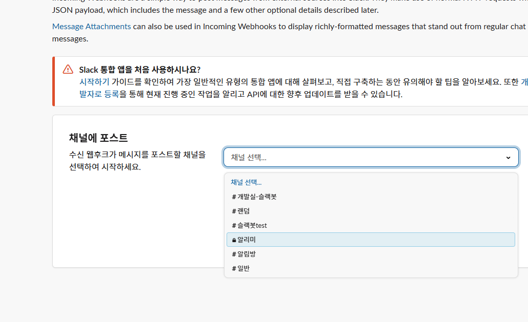 슬랙봇 메세지를 수신할 채널(채팅방)을 선택한다.