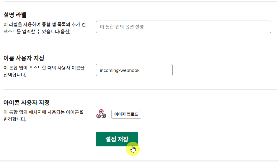 이름 / 이미지는 슬랙봇의 이름과 이미지이므로 필요하면 설정하면 된다.