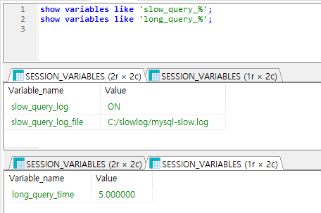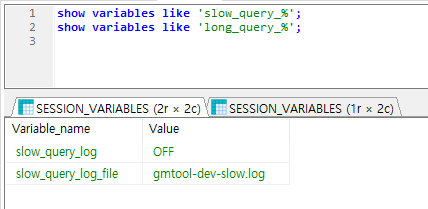 | show variables like 'slow_query_%'; show variables like 'long_query_%'; |