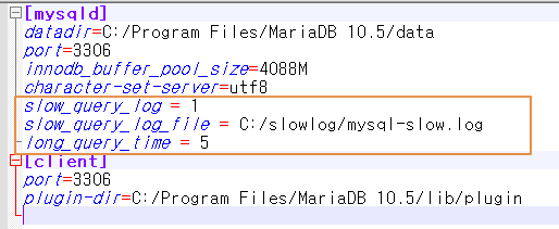 | slow_query_log = 1 slow_query_log_file = C:/slowlog/mysql-slow.log long_query_time = 5 |
