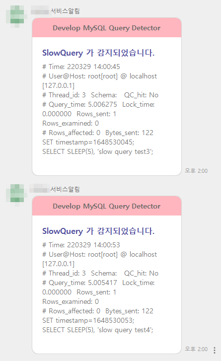 이렇게 해서, 프로그램을 돌려놓고, slow query 를 발생해보면, 알림이 오는것을 확인할 수 있다.
