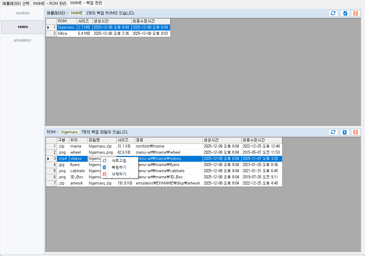AttractMode 의 romlists 경로에 있는 파일로 롬 목록을 백업하거나 복원할 수 있는 기능이다.