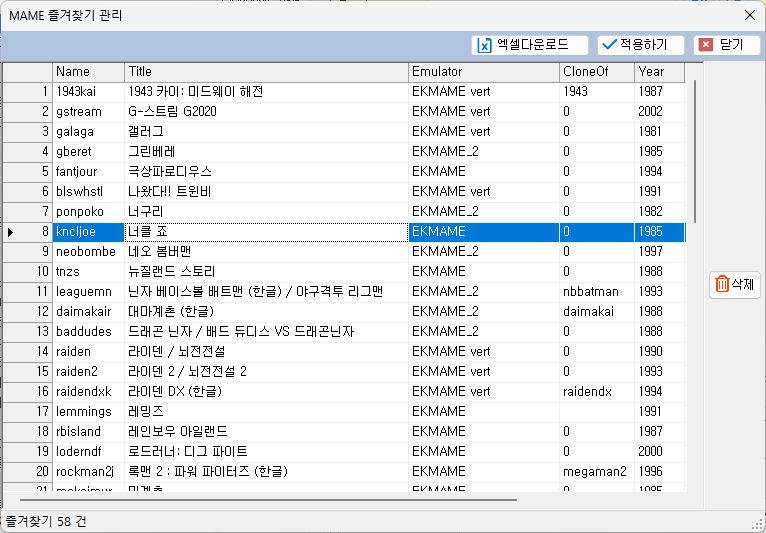왼쪽에는 romlists 파일에 등록된 모든 롬 목록이 나타나며,