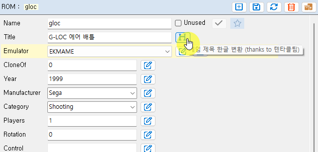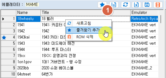 여기서 편집한 목록은 최종적으로 저장하기 아이콘을 눌러야지만 romlists 파일로 저장이 된다.