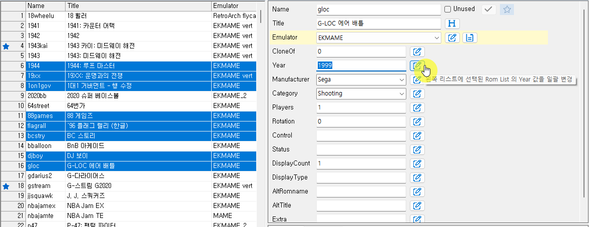 편집 창에서 일괄 변경 버튼을 눌러서, 동시에 여러개의 ROM 을 같은 값으로 변경할 수 있다.