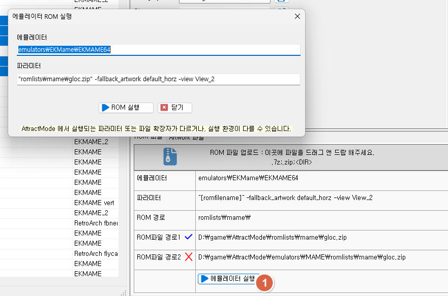 여기서 실행하는 방법은 실제 AttractMode 가 어뮬레이터를 구동하는 방식으로 실행해 볼 수 있다.